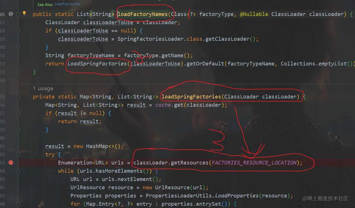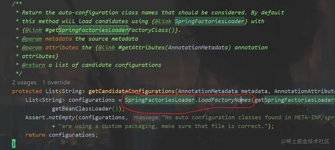它其实是一个加载类,里面封装了很多自动化配置的引用,通过导入这个类,间接把这些连接到这个类的配置类都注入到IOC里了。往下走,点击进入SpringFactoriesLoader.loadFactoryNames()方法,
