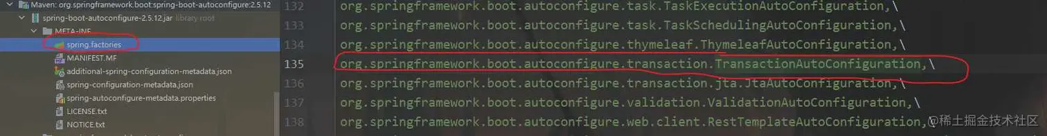 - 下一步会调用META-INF/spring.factories里的所有全类名的路径下的类进行加载,spring.factories里面有很多配置文件,篇幅原因,这里只讲解关于事务的,其他的配置有兴趣的铁子们可以自己看看。。。