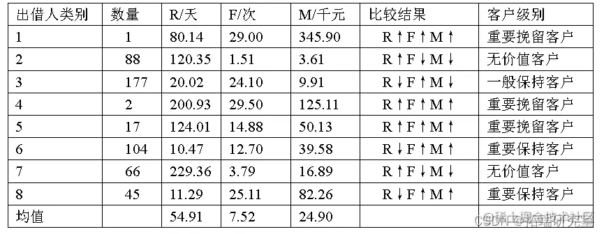 最后得到8类出借人类型,并将8类出借人的R、F、M均值与总R、F、M均值比较,其中“↑”表示大于平均值,“↓”表示小于平均值,结果如下表。