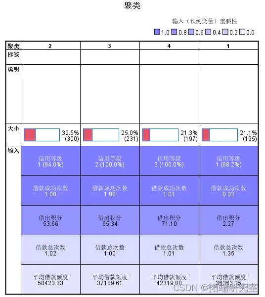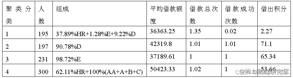 通过SPSS两阶段聚类方法,借款人被分为了4类,结果如下: