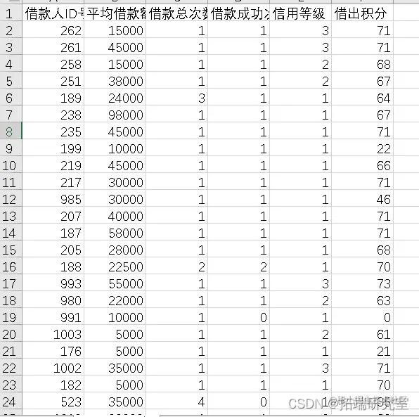 通过对数据源中借款人信息的整合,得到了用户活动数据,包括用户的借款次数、成功借款次数、信用等级、借款总额等信息。为了了解平台用户的不同行为模式与特征,这里本文选取借款人ID号、平均借款额度、借款总次数、借款成功次数、信用等级、借出积分(借款人作为出借人进行借贷所获得的借出积分)作为聚类变量。