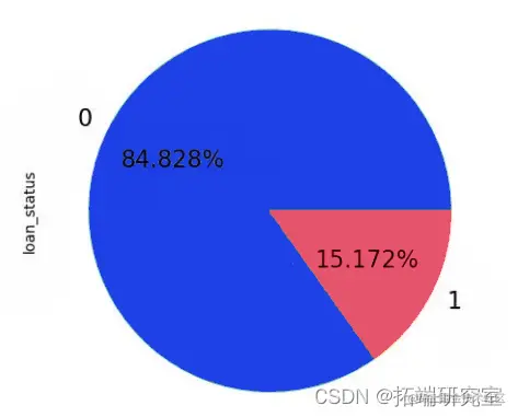 在着手处理数据之前,我们先了解一下基本的数据情况,为接下来的数据预处理, 特征工程和建模做准备。首先我们明确目标特征为 loan_status,原数据集中 fully paid 表示贷款完全结清,charged off 表示坏账注销。为了后期运用逻辑回归算法的方便,我们直接将其转换成数值变量,用 1 来表示违约,0 表示正常偿还。