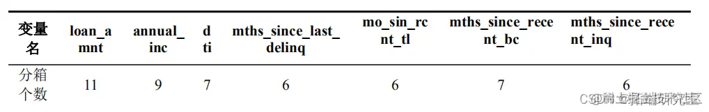 接着对特征进行最大IV值分箱,同时删除IV值较小的特征。最后得到部分连续特征的分箱结果如下。