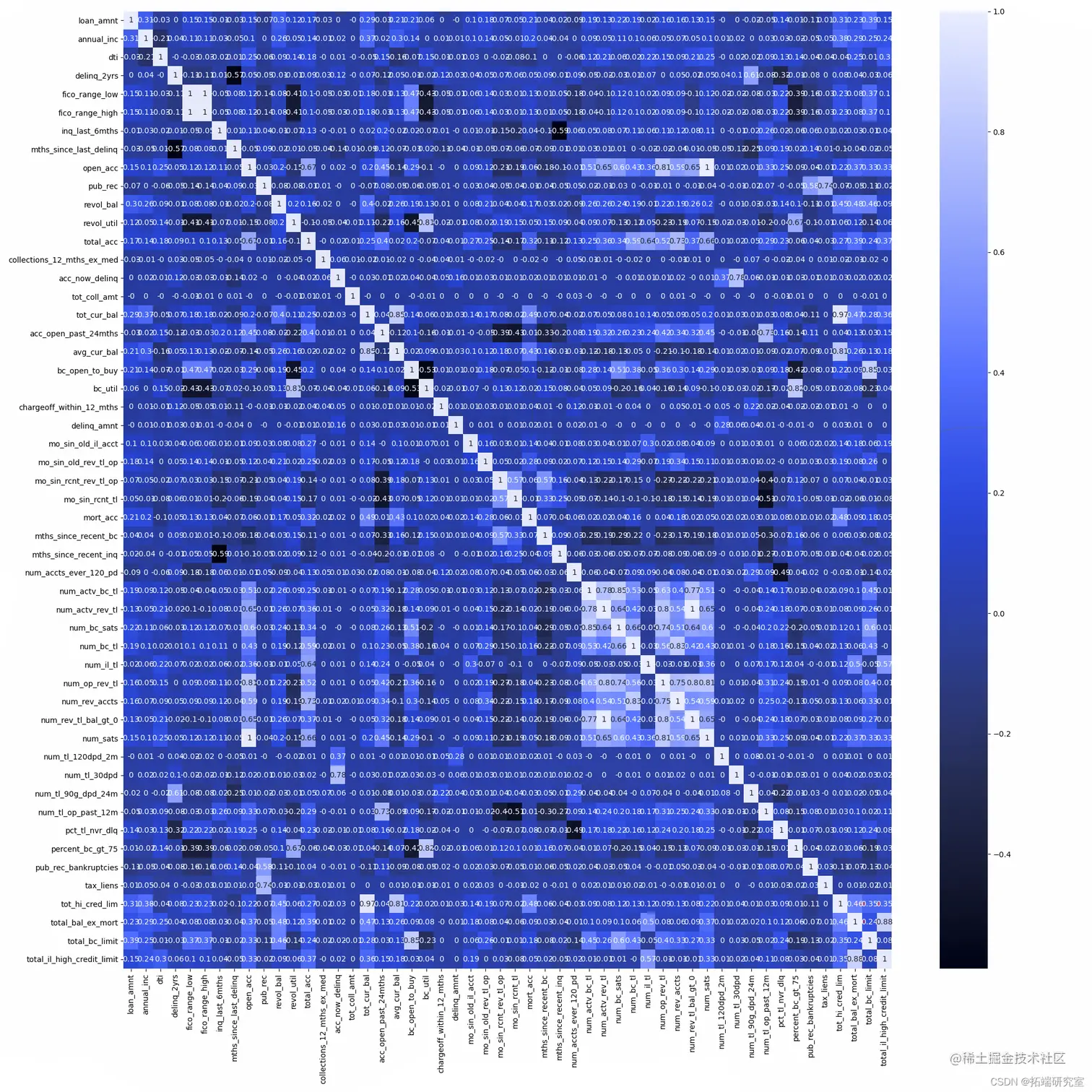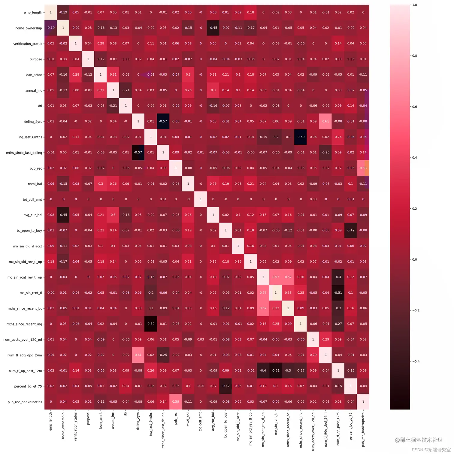 因为我们使用的算法为基于逻辑回归的评分卡和随机森林模型,特征之间的线性相关性会对模型建立的环节有所影响,所以利用热力图展示一下特征之间的相关性。