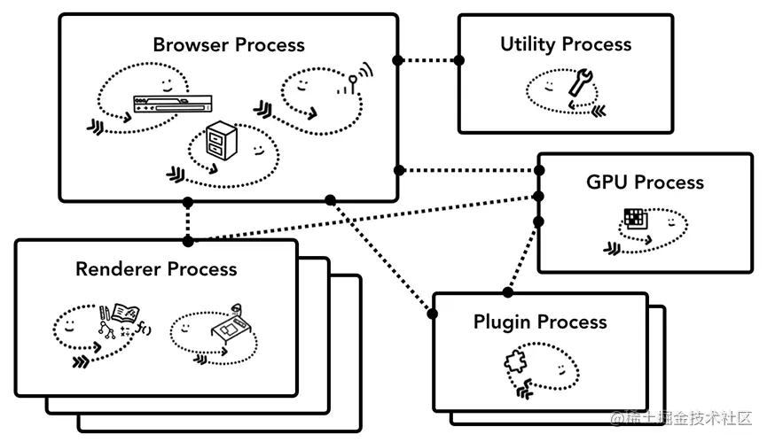 Chrome最新的架构:最上层是浏览器进程,负责协调承担各项工作的其他进程,比如实用程序进程、渲染器进程、GPU进程、插件进程等。