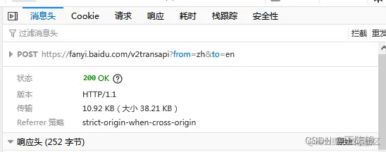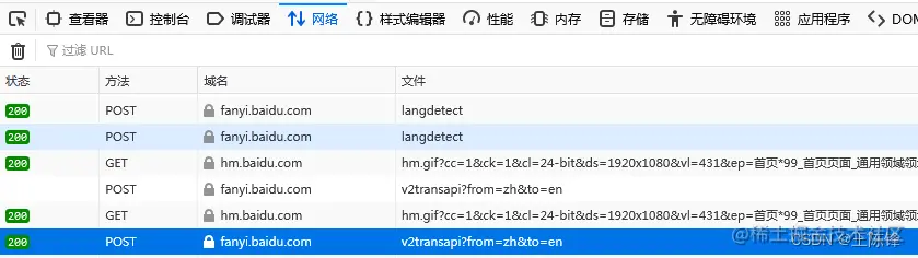 在百度翻译上,进行翻译,点开检查F12,可以在网络那边看到数据传输情况,看到后台的翻译网址,我们可以伪装前台的百度翻译网站,发送一样的数据给翻译后台,然后获取后台传输回来的翻译信息。百度翻译这边需要伪装下发送信息,伪装自己是个浏览器。不过有道翻译就不需要伪装是浏览器了。