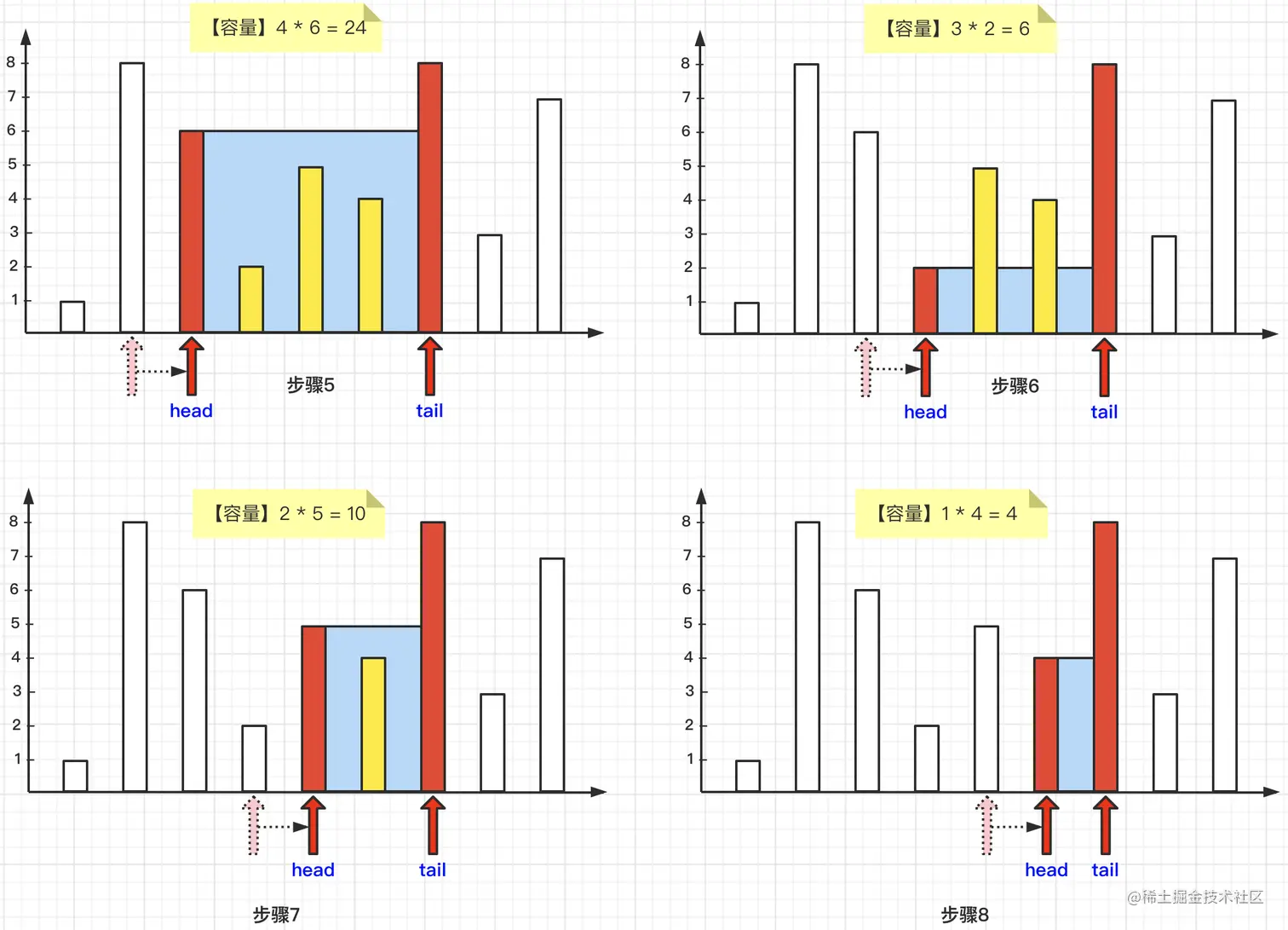 那么根据双指针算法,我们需要让head指针或者tail指针向彼此靠拢,那么移动哪一个指针的?我们会根据对比两个木桩的高度,去移动那个更短的。比如,head指针指向的木桩较短,那么我们将head指针向右移动。但是如果是tail指针指向的木桩较短,那么我们就将tail指针向左移动。当两个指针在某个位置相遇,则结束整个过程。