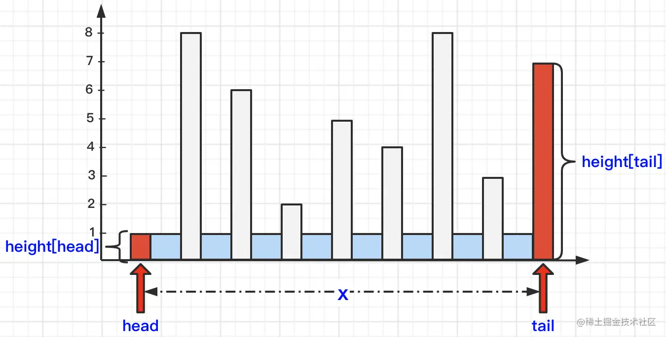 那么双向指针的解法就是创建两个指针——head头指针和tail尾指针。最初head指向height数组中index=0的位置,tail指向height数组中index=height-1的位置。那么此时情况假设我们如下图所示,height[head]是小于height[tail]的,head指针与tail的指针长度为x(即:tail - head = height - 1 - 0),那么此时水槽可以承载的水容量就等于:height[head] * x。如下图所示: