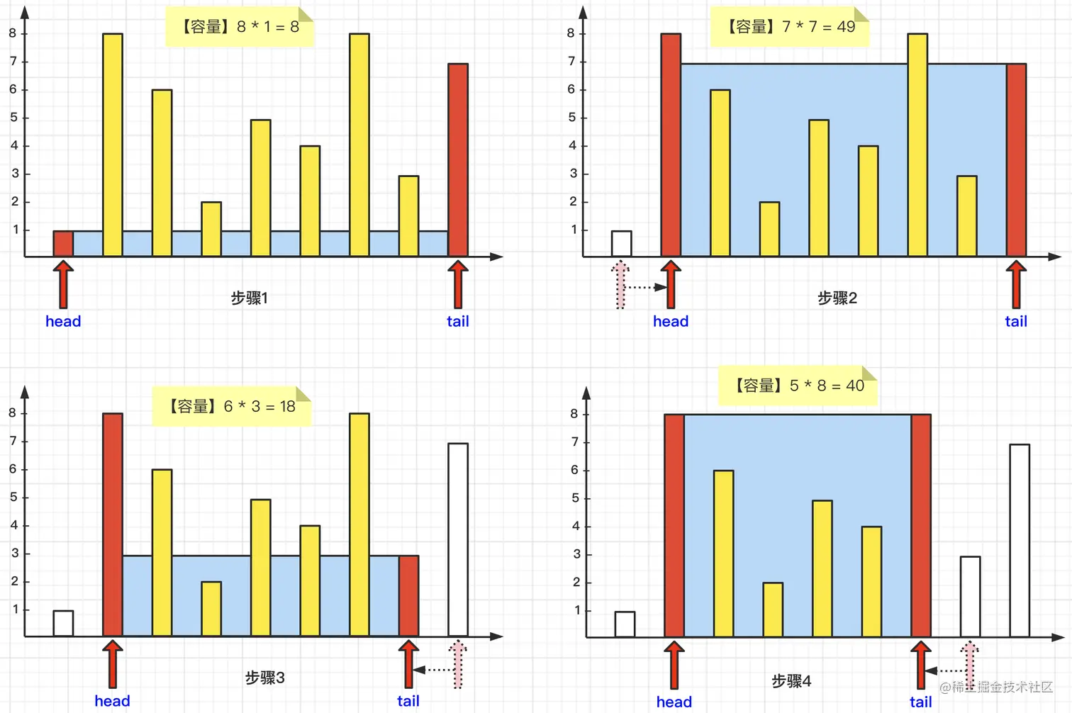 那么上面我们介绍了如何去计算最大盛水容量,下面就以题目中的第一个示例1为例,通过每一步骤执行的图解方式,完整的展现一次执行的全过程。那么示例1中,height数组中的元素为[1,8,6,2,5,4,8,3,7],我们依次通过移动head指针或者tail指针,并且计算出每次的“最大容量” ,并通过Math的max函数,将最终的最大容量作为结果进行返回。下面是具体的8个执行步骤,如下所示: