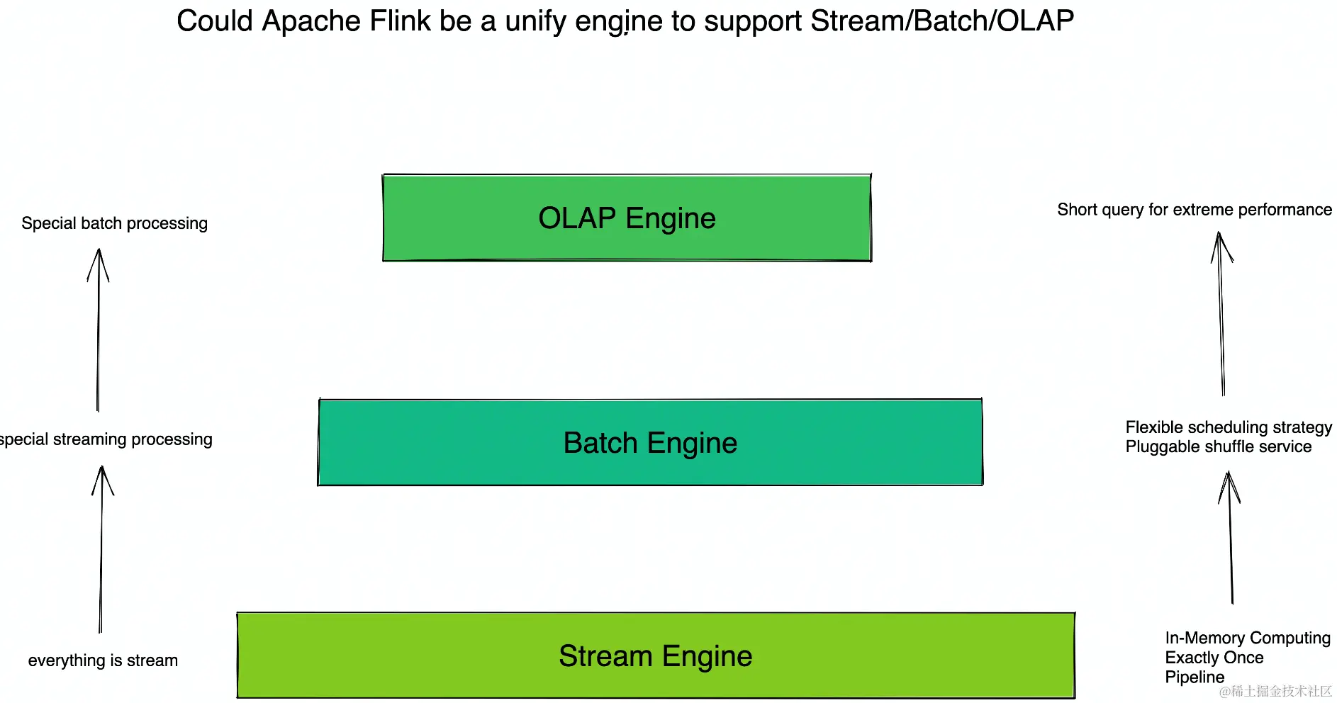 Apache Flink从流式计算出发,需要想支持Batch和 OLAP场景,就需要解决下面的问题: