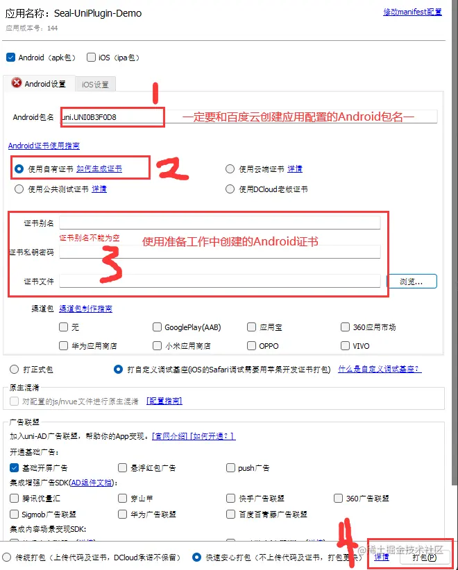 - Android端:生成Android打包keystore证书文件及获取MD5(非常重要),参考文档:Android平台签名证书(.keystore)生成指南 - DCloud问答