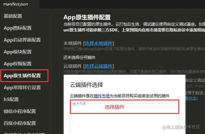 Step4:打开manifest.json—》App原生插件配置—》选择云端插件