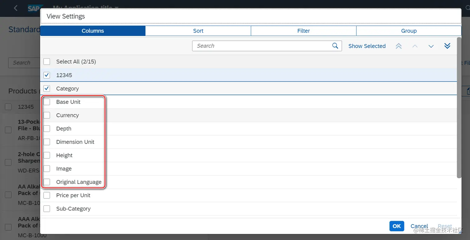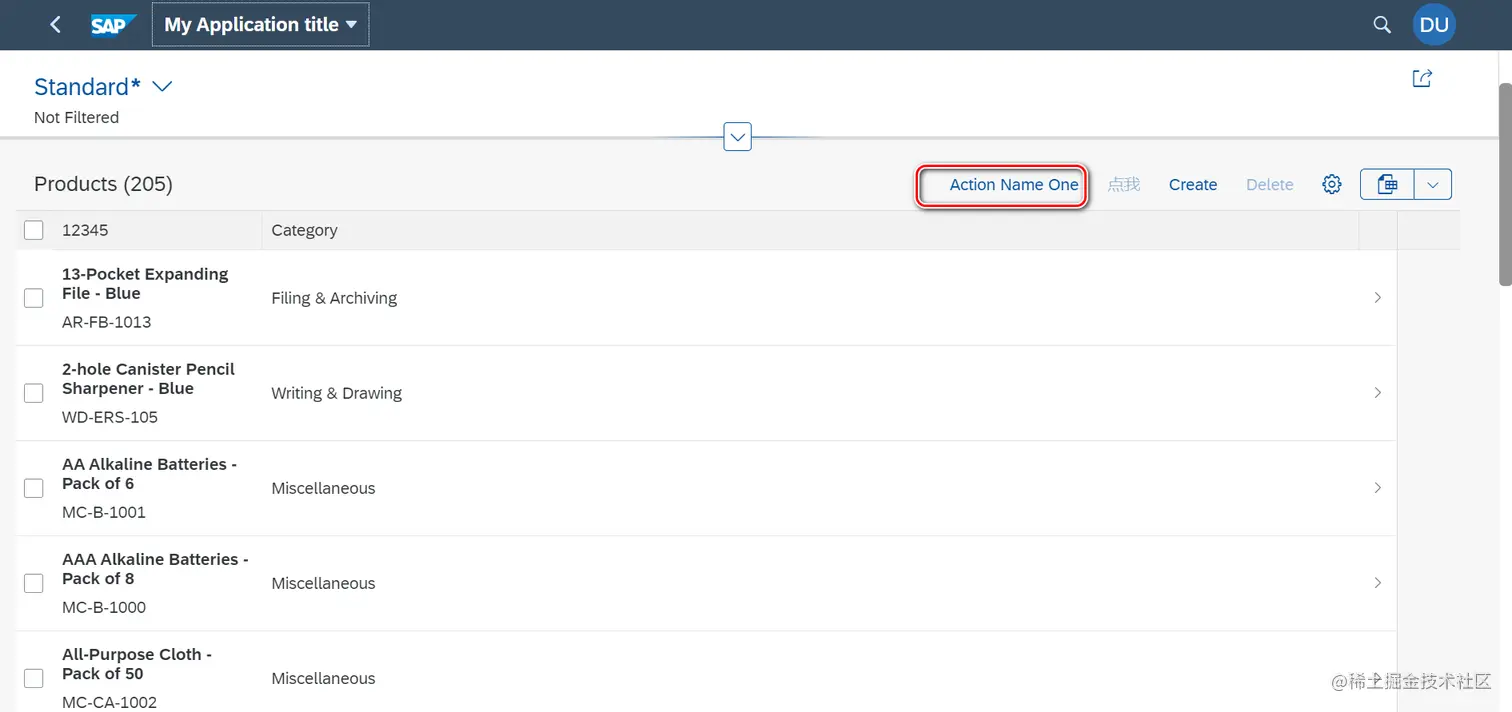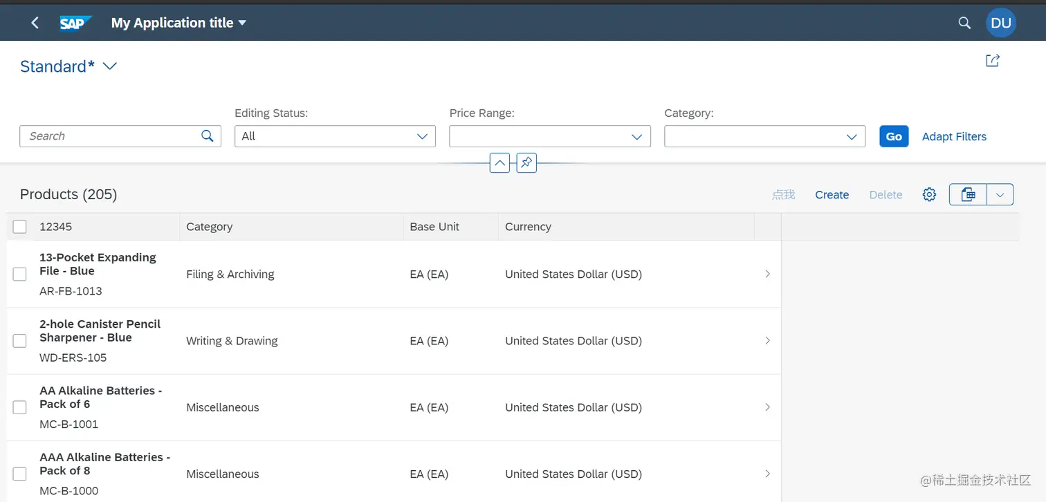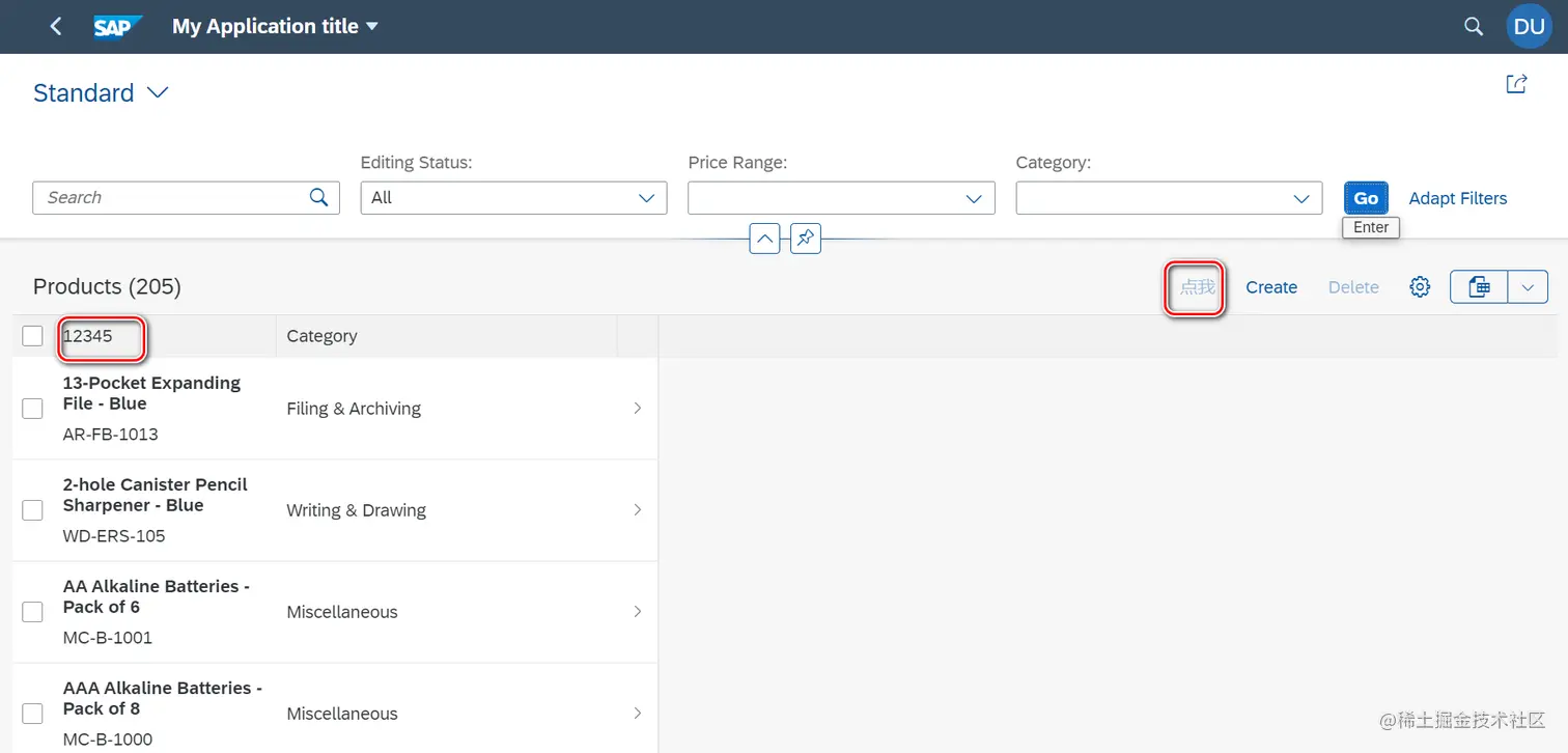 上面的代码重新定义了 Copy 按钮的标签,同时 List Report 默认只显示两个表项:Product 和 MainProductCategory,同时将 Product 的 Label 更改为 12345,运行时效果: