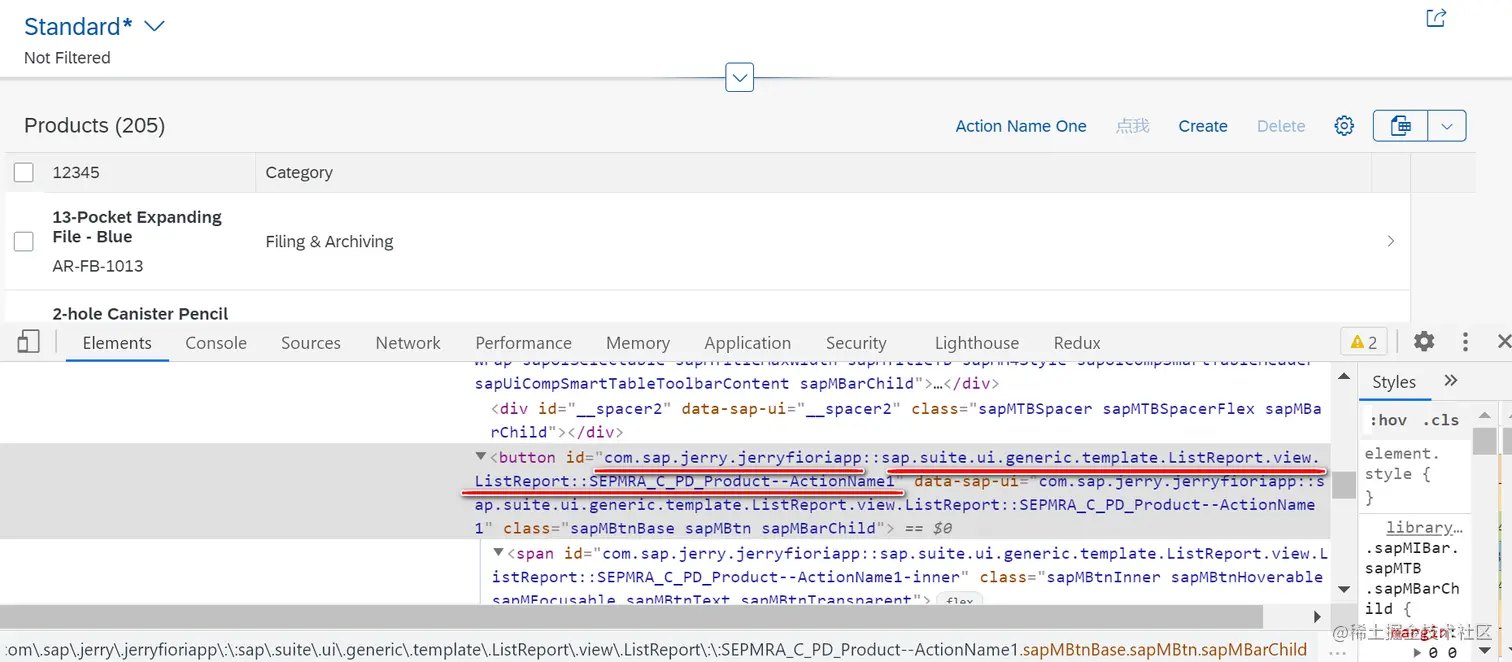 查看运行时该按钮渲染的 HTML 代码,发现是 Fiori Elements id + 应用类型(sap.suite.ui.generic.template.ListReport.View.ListReport) + manifest.json 里定义的 entitySet + manifest.json 里定义的 Action 名称拼装而成。