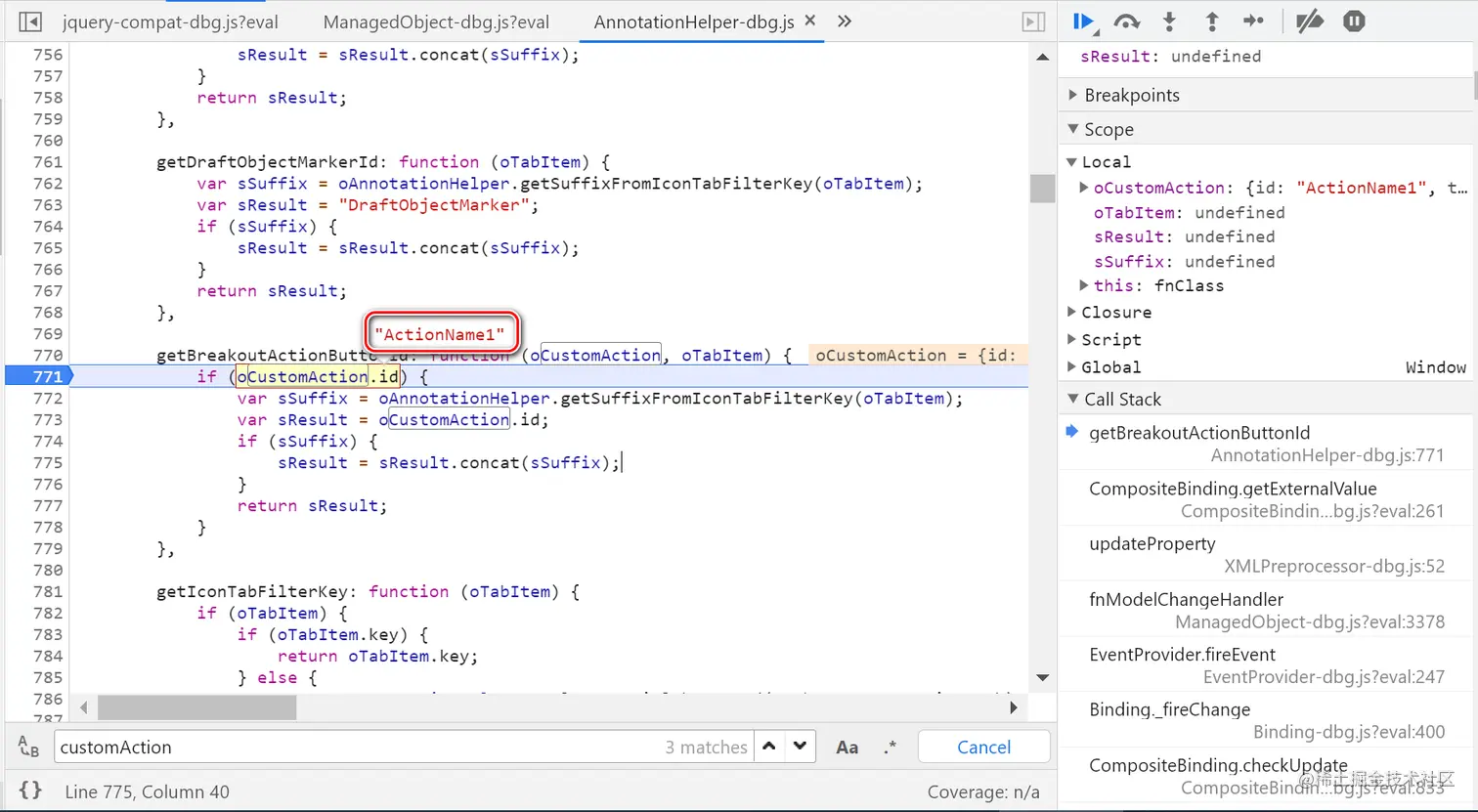 这种自定义按钮,在 SAP Fiori Elements 世界里有个术语叫做 Breakout action,其 id,即我们 controller extension 里定义的 action ID,在 AnnotationHelper.js 的 getBreakoutActionButtonId 里被解析出来: