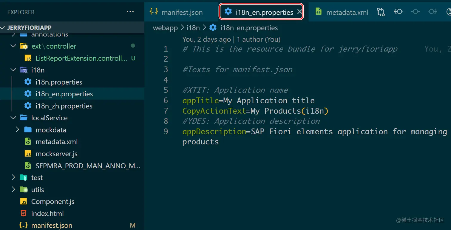 - 在 SAP Fiori Elements 项目工程里,修改 manifest.json,添加如下代码: