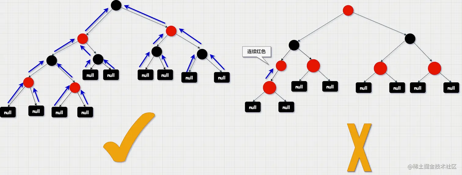 - 任意节点到叶子节点的所有路径上黑色节点数相同;