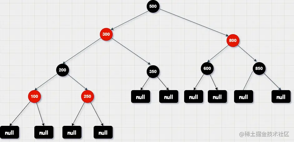 这是一颗红黑树,可以观察到任意一个节点到叶子节点的路径上黑色的节点数都是相等的;以500,200节点为例: