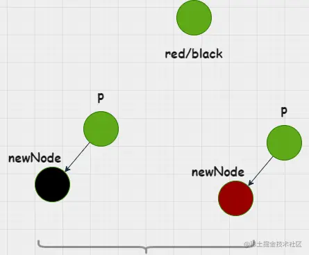 以上图为例,当新节点为黑色那么必然导致其父节点的左右分支黑色节点数不等;当新节点为红色,不会影响其父节点左右分支的黑色数;如果p是黑色,则不用调整红黑树;但是如果p是红色,则造成连续红色冲突。这个时候需要调整红黑树;
