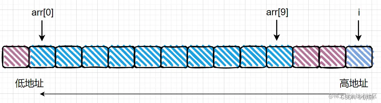 - i和arr是局部变量,局部变量开辟在栈区上。