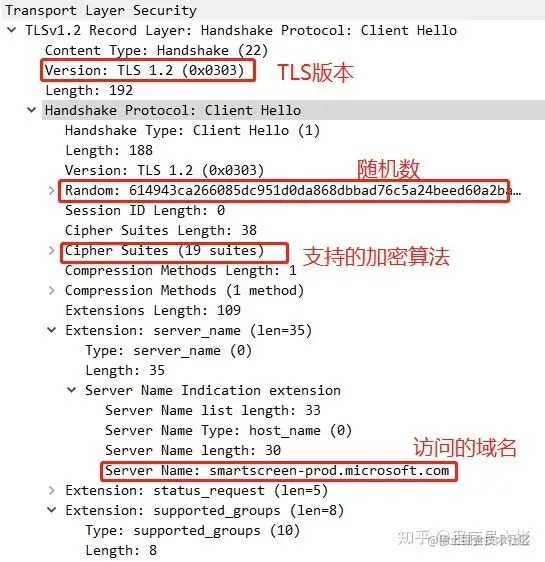 Client Hello里面客户端会告知服务端自己当前的一些信息,包括客户端要使用的TLS版本,支持的加密算法,要访问的域名,给服务端生成的一个随机数(Nonce)等。需要提前告知服务器想要访问的域名以便服务器发送相应的域名的证书过来。\