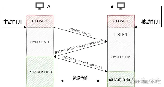 SYN=1,序列号seq=x。第一次握手前客户端的状态为CLOSE,第一次握手后客户端的状态为SYN-SENT。此时服务端的状态为LISTEN。 - 第二次握手:服务端在收到客户端发来的报文后,会随机生成一个服务端的起始序列号y,然后给客户端回复一段报文,其中包括标志位
