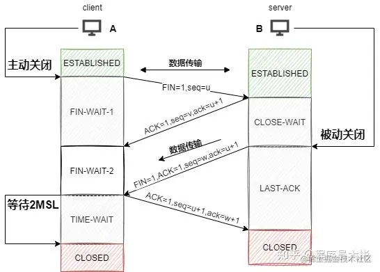 ACK=1,seq=u+1,ack=w+1),A进入TIME-WAIT(时间等待)状态。此时TCP未释放掉,需要经过时间等待计时器设置的时间2MSL(最大报文段生存时间)后,A才进入CLOSED状态。B收到A发出的确认报文段后关闭连接,若没收到A发出的确认报文段,B就会重传连接释放报文段。