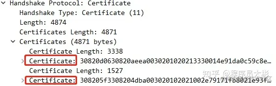 - 接着服务端给客户端发来了2个证书。第二个证书是第一个证书的签发机构(CA)的证书。\