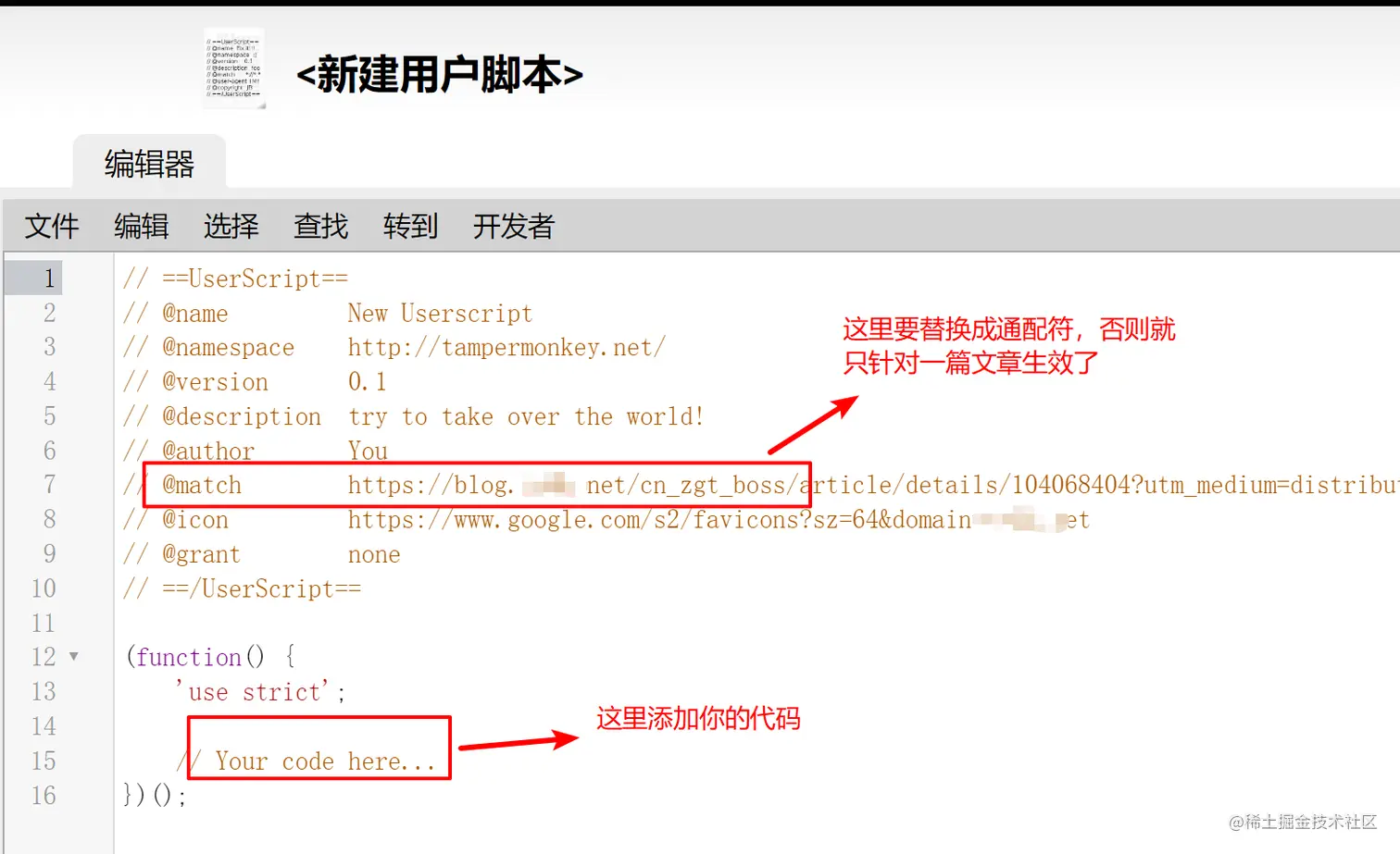 脚本的上半部分是一些基础属性的设置,比如名字、图标、命名空间等,如果是你自己用的话,其他的不用管,直接去修改@match项就好了,这个表示的是脚本执行的页面,比如我这个,需要在这个网站的所有博客文章下生效,因此我将这一行改为带有通配符的地址: