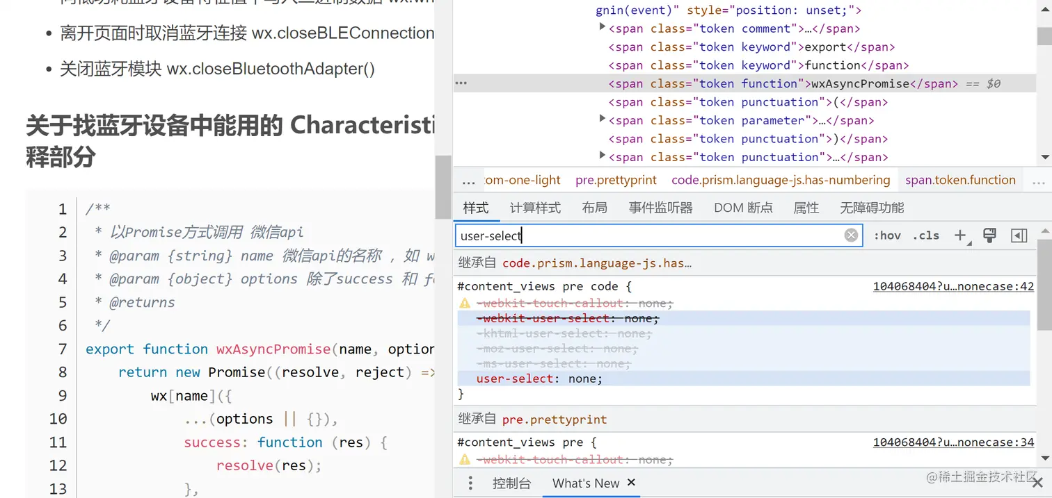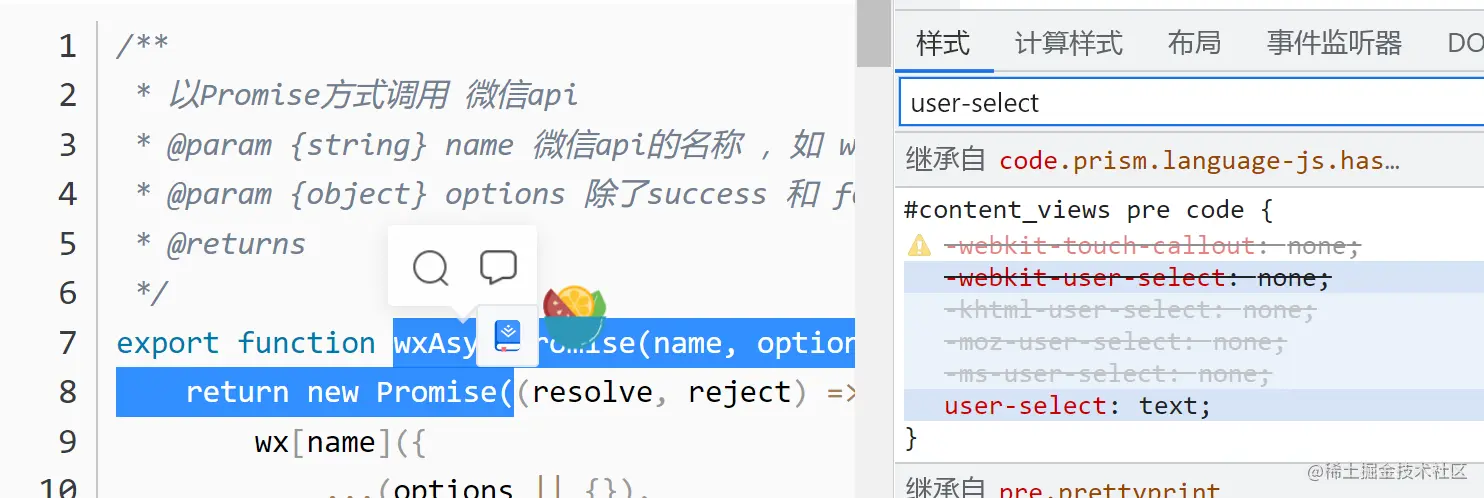 既然如此,那就从CSS上下手吧,一般来说,拖动无法复制一般都是由CSS的user-select属性来控制的。选中代码区域相关的DOM,在样式筛选条件中输入user-select,果不其然,出现了user-select属性: