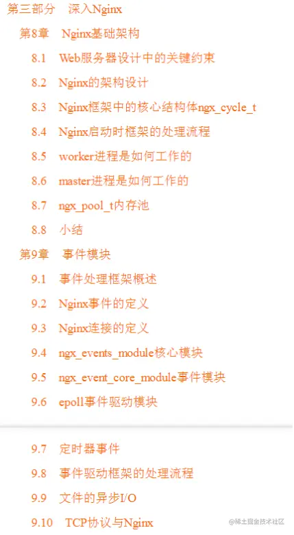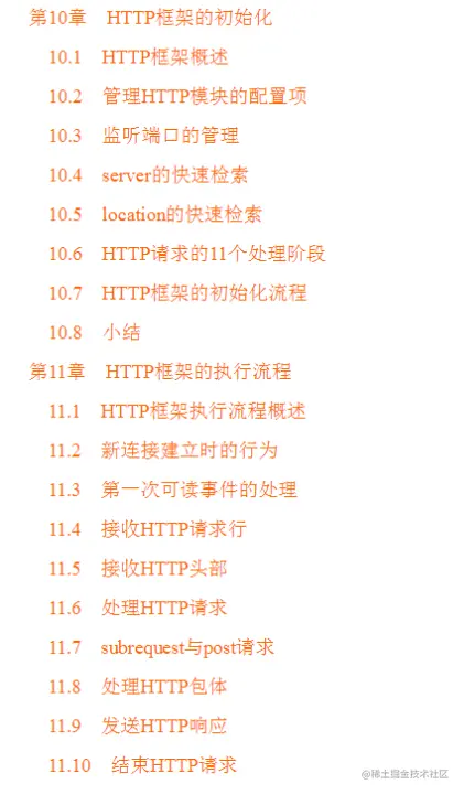 在第三部分,将开始介绍Nginx的完整框架,阅读到这里将会了解第二部分中HTTP模块为何以此种方式开发,同时将可以轻易地开发Nginx模块。这一部分并不仅仅满足于阐述Nginx架构,而是会探讨其为何如此设计,只有这样才能抛开HTTP框架、邮件代理框架,实现一种新的业务框架、一种新的模块类型,主要内容如下: