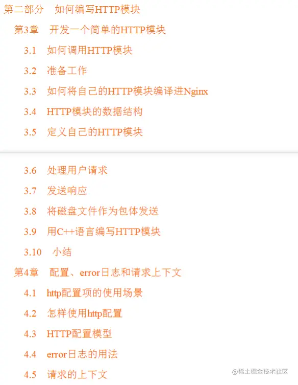 这一部分介绍配置项的方式,更偏重于领着对Nginx还比较陌生的读者熟悉它,通过了解几个基本Nginx模块的配置修改方式,进而使读者可以通过查询官网、第三方网站来了解如何使用所有Nginx模块的用法,主要内容如下:
