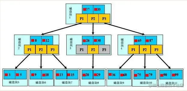 如上图,是一颗b+树,关于b+树的定义可以参见B+树,这里只说一些重点,浅蓝色的块我们称之为一个磁盘块,可以看到每个磁盘块包含几个数据项(深蓝色所示)和指针(黄色所示),如磁盘块1包含数据项17和35,包含指针P1、P2、P3,P1表示小于17的磁盘块,P2表示在17和35之间的磁盘块,P3表示大于35的磁盘块。真实的数据存在于叶子节点即3、5、9、10、13、15、28、29、36、60、75、79、90、99。非叶子节点只不存储真实的数据,只存储指引搜索方向的数据项,如17、35并不真实存在于数据表中。
