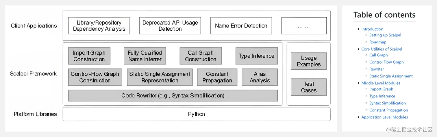 Scalpel 是一个通用的 Python 静态分析框架,包含建立函数间控制流图、解释不同Python模块的导入关系等多种功能,以便开发者实现『以问题为中心』的专属静态分析器。下图描述了目前的设计架构。