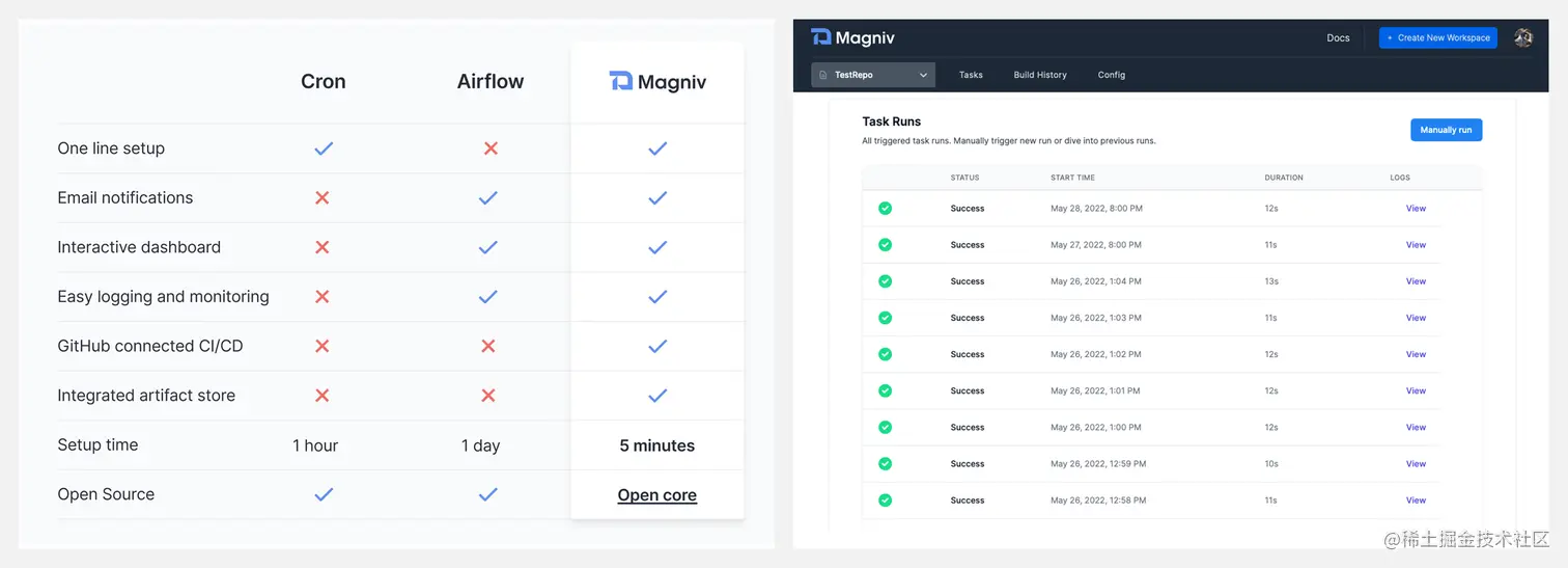 Magniv 是基于 Python 装饰器的协调库,使得数据科学家和开发人员在一行代码中完成任意函数的调用,是建立&部署数据应用程序、管道或类似 cron 的最简单的平台。在一个完全管理的环境中,Magniv的监控、CI/CD和计算管理功能都是开箱即用的。