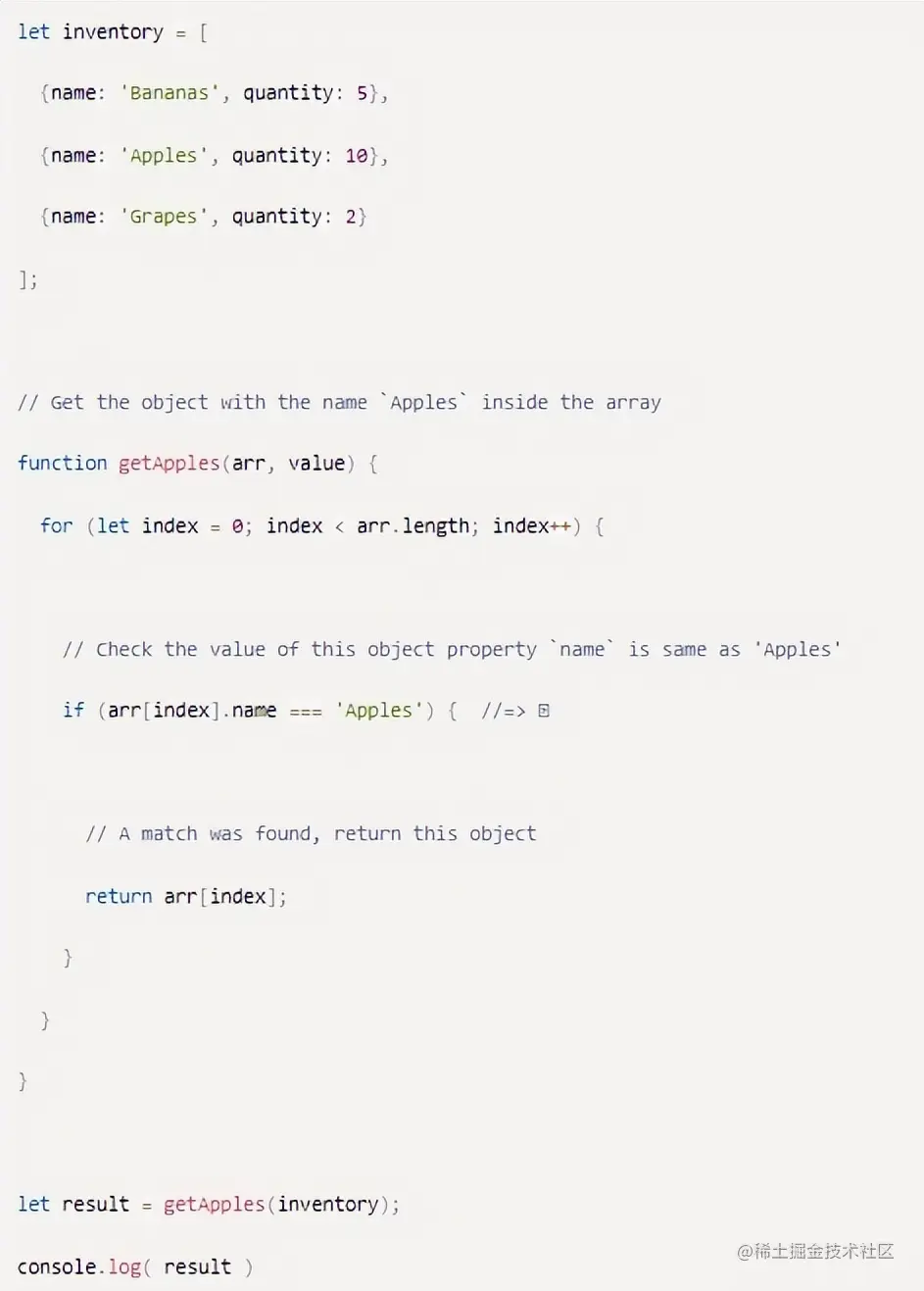 要通过其中一个属性从对象数组中查找对象的话,我们通常使用for循环: