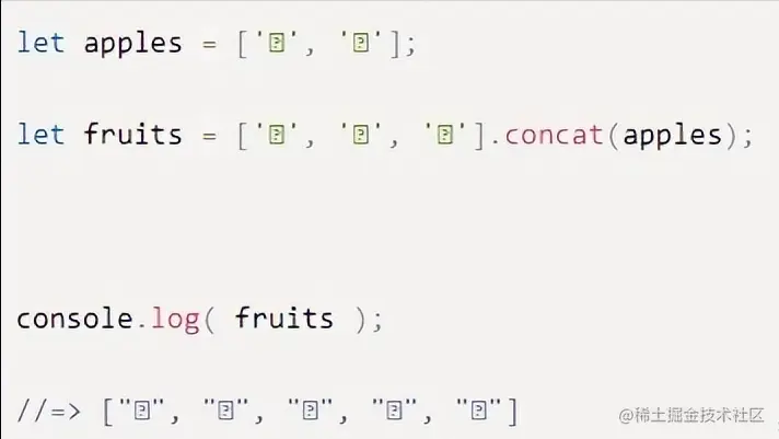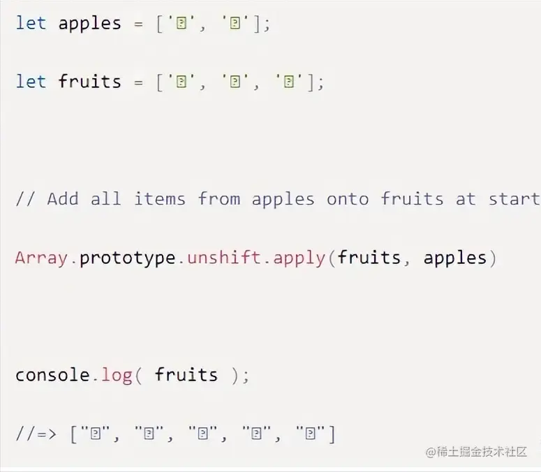 假设我们想将apples数组中的所有项添加到Fruits数组的开头,而不是像上一个示例中那样放在末尾。我们可以使用Array.prototype.unshift()来做到这一点: