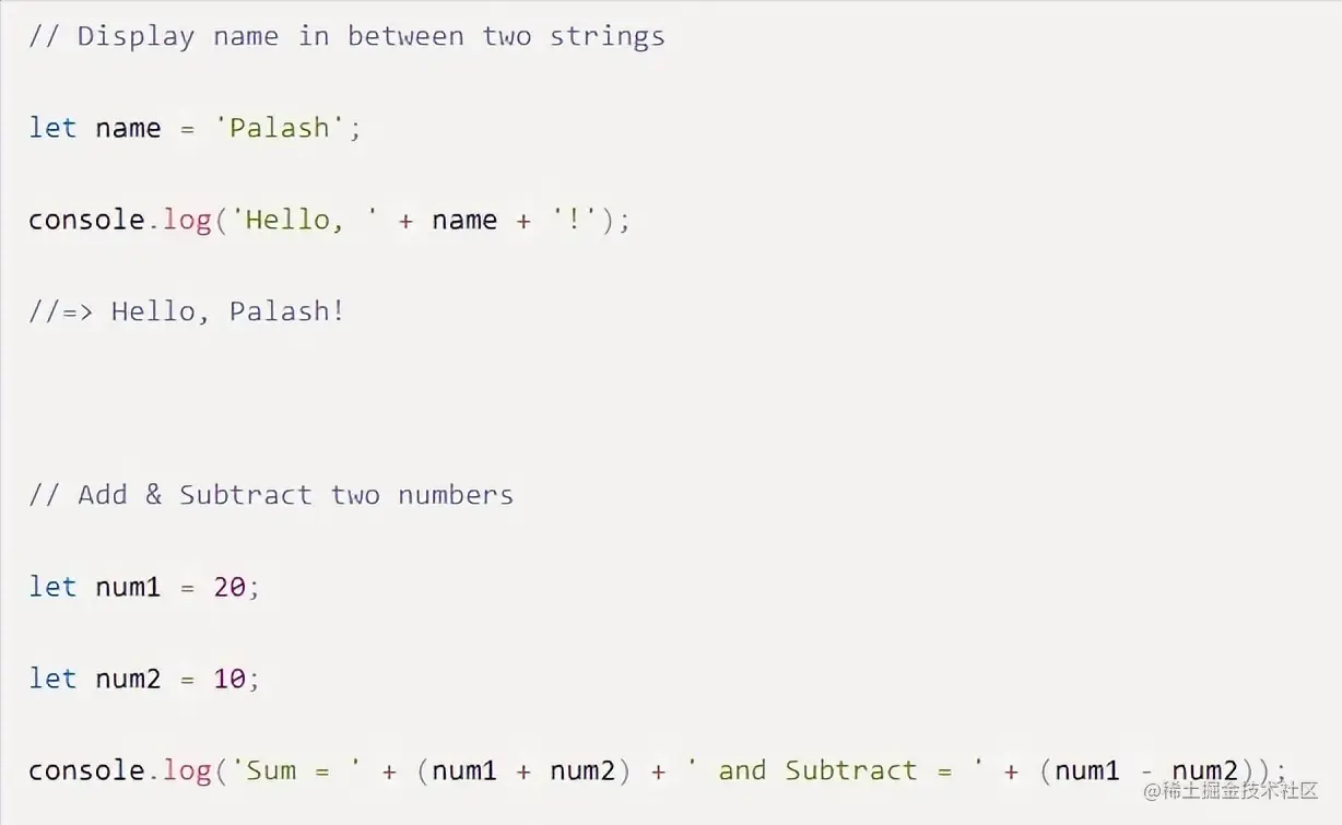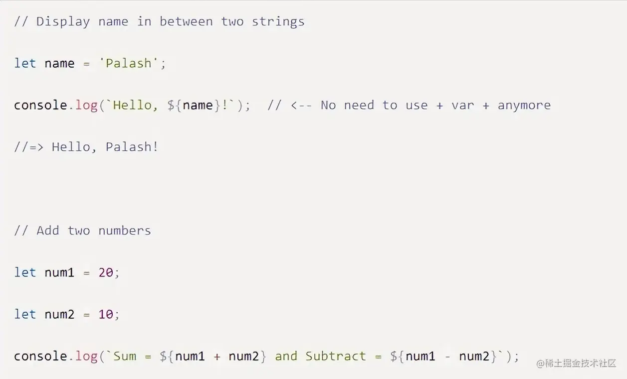 通过模板字面量,我们可以使用反引号(),这样我们就可以将表达式包装在${…}`中,然后嵌入到字符串,如下所示: