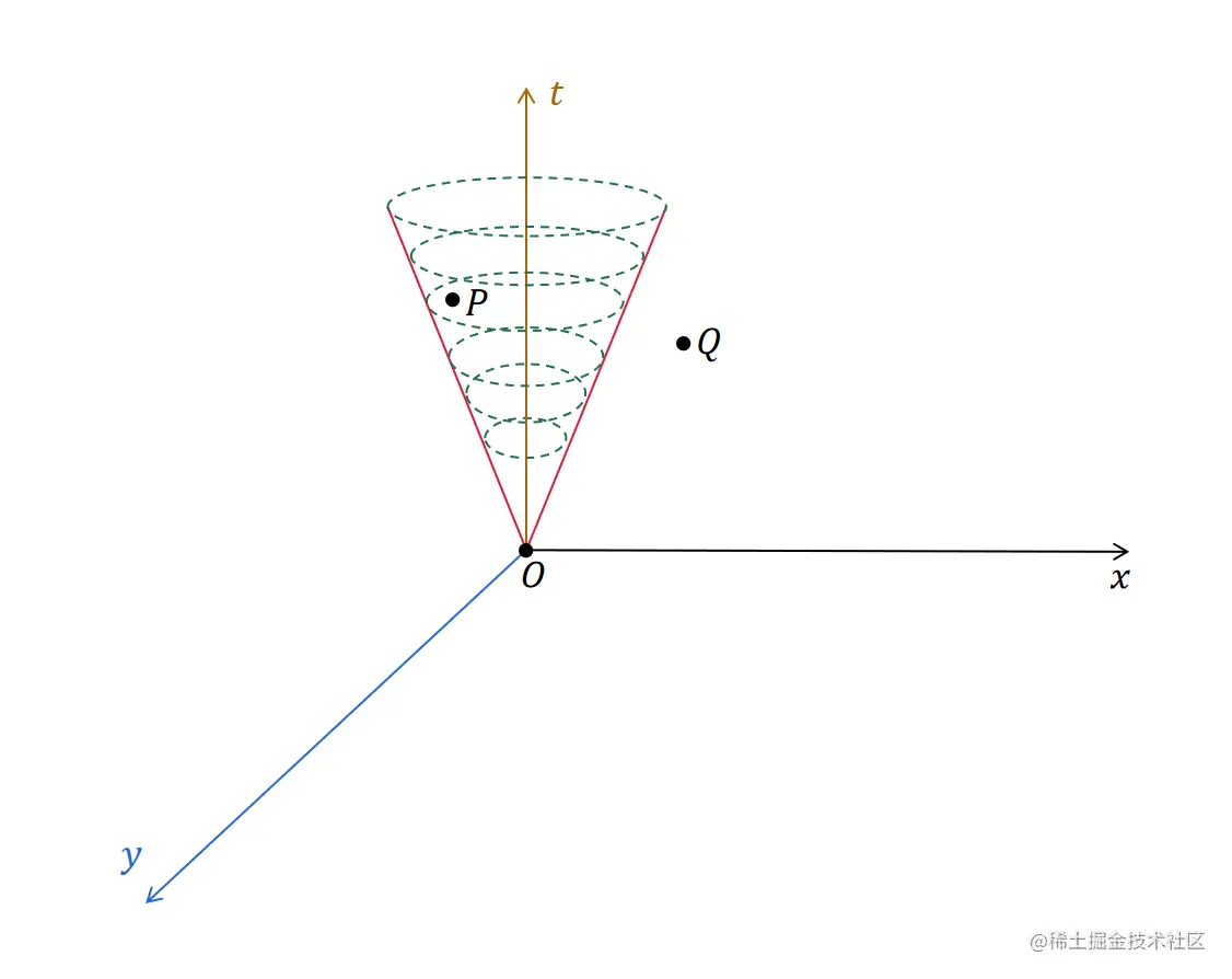 在这个三维时空坐标系中,每个点都可以是一个事件。比如点P,表示在特定位置、特定时刻发生的某个事件。同理,点Q也可以表示一个事件。而原点O,可以表示在原点位置发生于时刻0的事件。