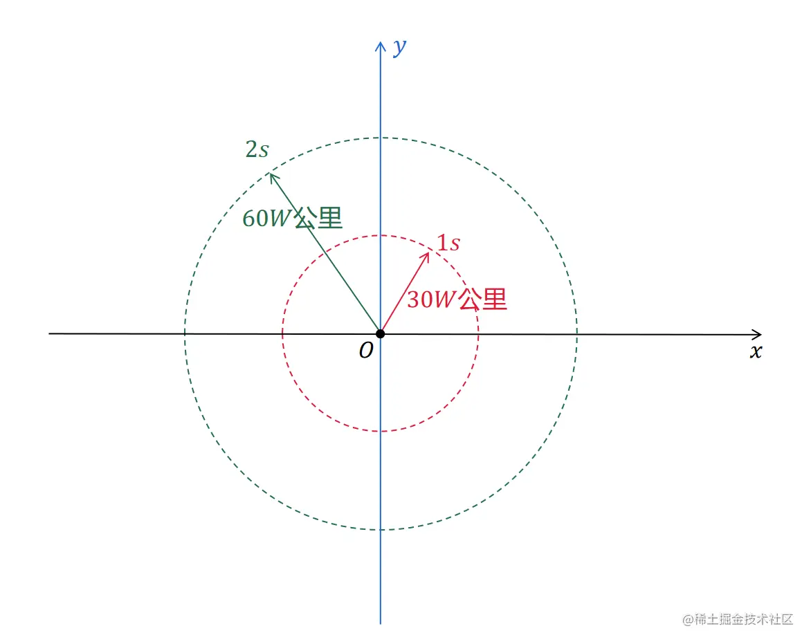 平面上有一个点O,这个点的位置上放置了一个光源。我们以点O为原点,建立一个二维坐标系。位于O点的光源发出的光线,会在这个平面上朝着四周各个方向传播。根据光的传播速度计算,这些光线在1秒后会到达以O为圆心、以30W公里为半径的圆周,在2秒后会到达以O为圆心、以60W公里为半径的圆周。