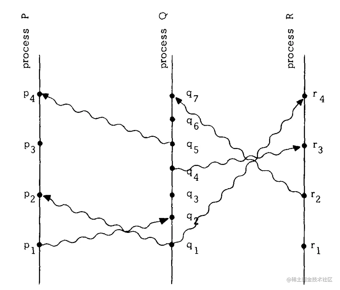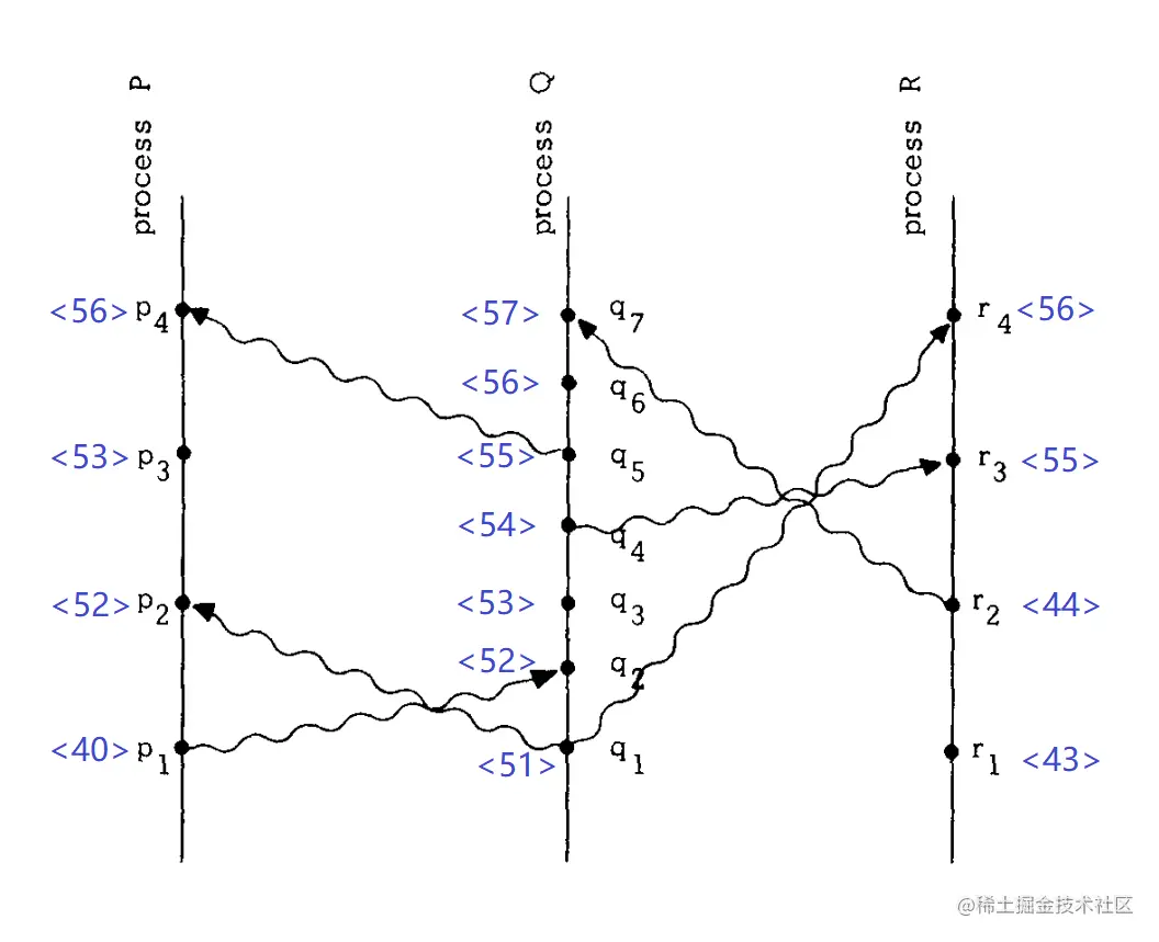 - 同一个消息的发送事件和接收事件,具有「Happened Before」关系。比如,p1和q2分别表示同一个消息的发送事件和接收事件,所以p1→q2;同理,q4→r3。