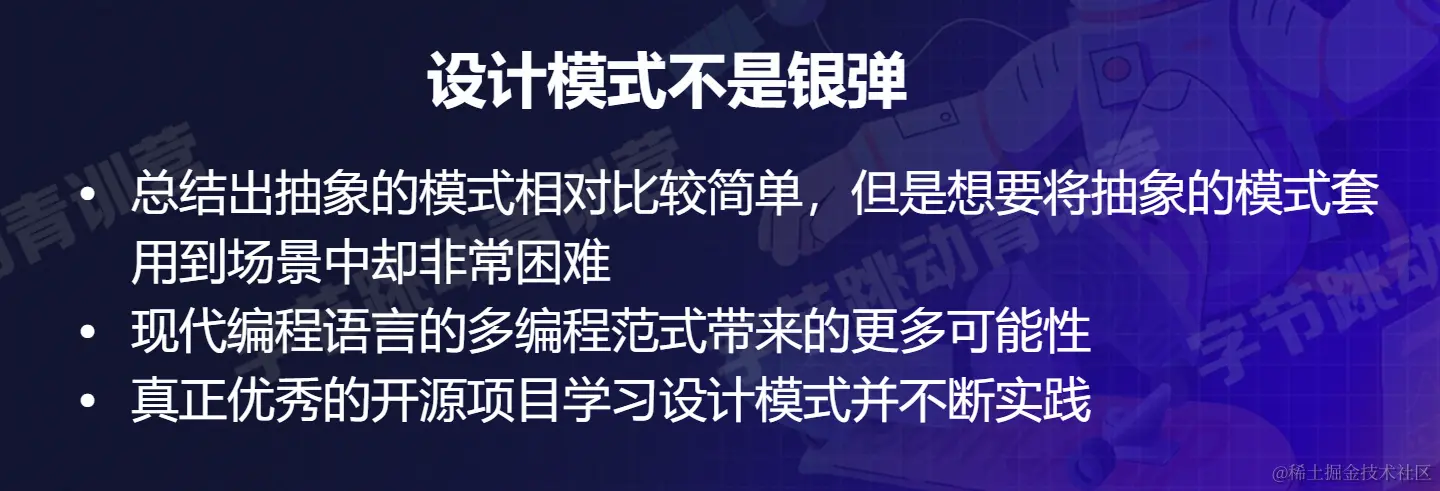 设计模式更多的是指导思想和方法论,而不是现成的代码,每种设计模式在不同语言中有不同的具体实现方式。学习设计模式更多的是理解各种模式的内在思想和解决的问题。