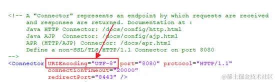 这种乱码主要发生在 GET 请求中,因为在 GET 请求中我们一般通过 URL 来传递参数,这个问题可以在代码中解决,但是太过于麻烦,因此一般我们直接在Tomcat配置中解决,修改 Tomcat的conf/server.xml 文件,修改 URL 编码格式,如下: