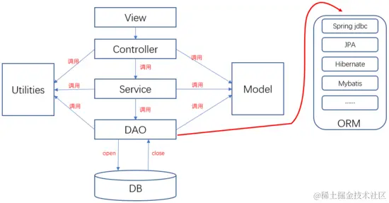 4.DAO层。DAO层表示数据访问层,可采用的技术如jdbc和ORM框架(如Spring JDBC,JPA,Hibernate,Mybatis等)