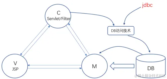 1.在该阶段架构模式中,Servlet/Filter扮演Controller角色,JSP扮演View角色,JavaBean扮演Model角色