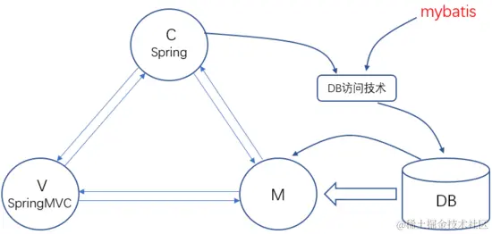 1.该模式中,Spring扮演Controller角色,SpringMVC扮演View角色(当然,小型系统,可直接采用SpringMVC即可),Mybatis扮演DB访问技术