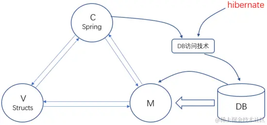 1.在该架构模式中,Controller采用Spring框架技术,View采用Structs框架技术,DB访问技术采用Hibernate框架技术