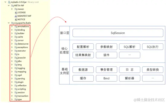 1.根据Mybatis源码,将其抽象为三层:基础支持层,核心处理层和接口层