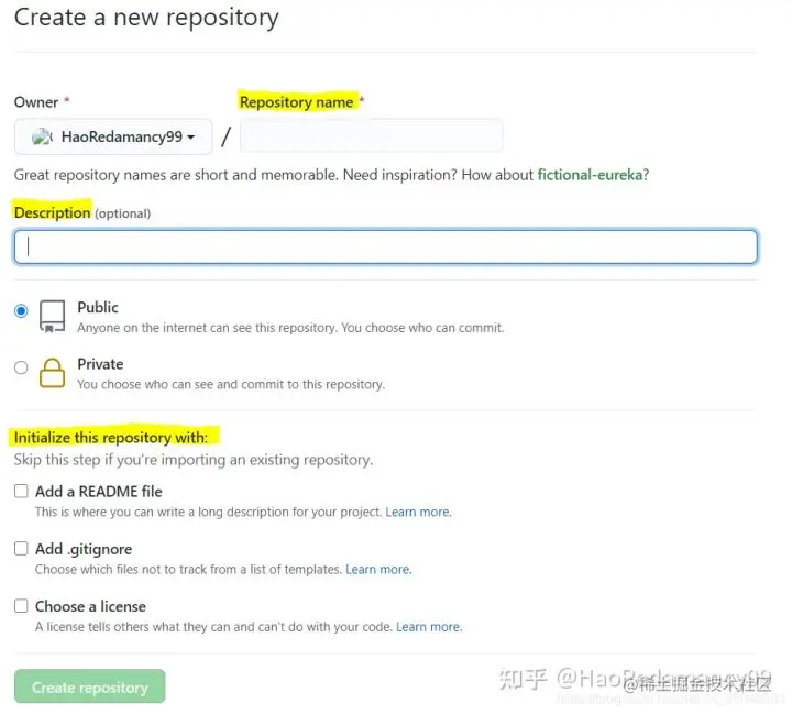 可能之后会选择免费或者付费仓库,选择免费即可。免费:所有人都可以访问无限。 付费仓库:自己或者规定朋友才可访问。