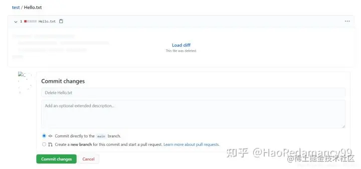 删除文件会弹出删除描述,点击Commit changes